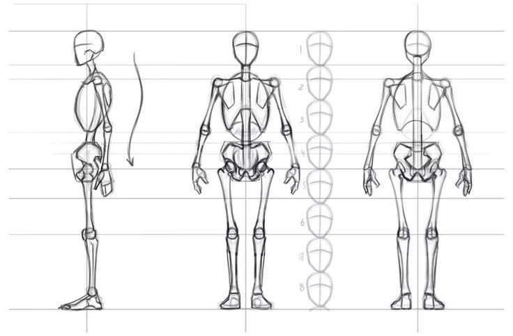 - Главное знать основные построения. В классическом рисунке считают, что рост человека приблизительно равен 8 нарисованным головам. К примеру: 1 голова лицо, 2-3 голова грудная часть (грудная клетка), 4 голова талия, 5-6 голова бедра и колени, 7-8 голени и стопы. Всё конечно также зависит от того, насколько высокого человека вы пытаетесь изобразить. Такой способ поможет вам сохранить равноценные пропорции, сохранить баланс в рисунке и в целом сделать его хорошо выглядящим.